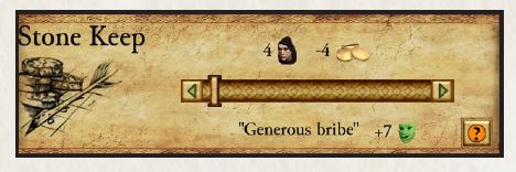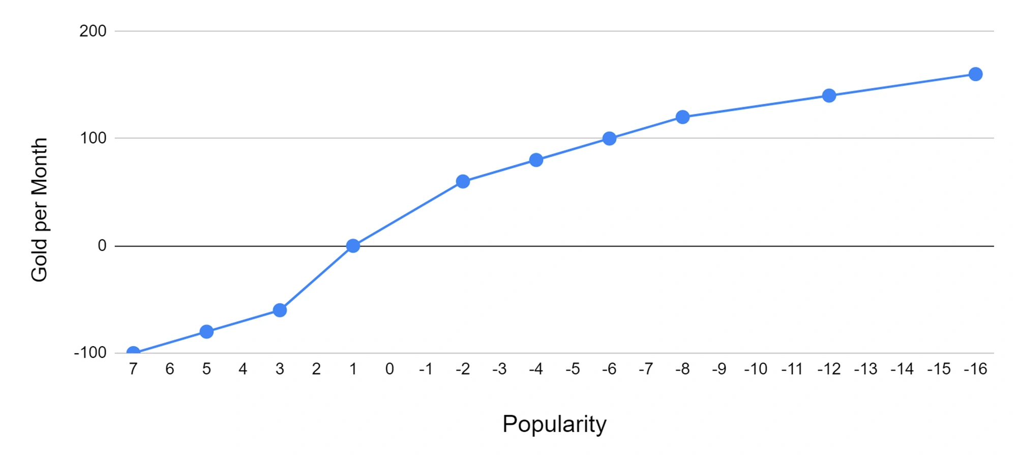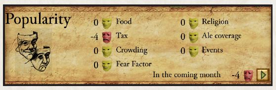 مالیاتها بسته به اندازه جمعیت شما، درآمد ماهانه غیرفعال ایجاد میکنند. نمودار زیر درآمد ماهانه با ۱۰۰ نفر جمعیت را نشان میدهد. هر امتیاز نشاندهنده یک گزینه مالیات قابل انتخاب است. با افزایش مالیات، به ازای هر رضایت خرج شده، طلای کمتری دریافت میکنید. با جمعیت ۱۰۰ نفر، «مالیاتهای پایین» ماهانه ۳۰ طلا به ازای هر رضایت تولید میکنند (۶۰ طلا، ۲- رضایت). با این حال، «مالیاتهای کاملاً بیرحمانه» ماهانه فقط ۱۰ طلا به ازای هر رضایت تولید میکنند (۱۶۰ طلا، ۱۶- رضایت). با توجه به مقدار زیاد طلا به ازای هر رضایت، «مالیاتهای پایین» باید تا حد امکان استفاده شود.