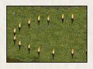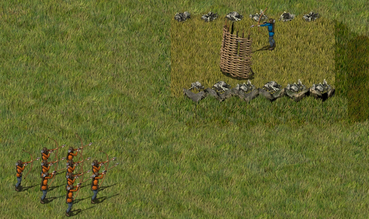 مزیت زمینی در ترکیب با سپرها میتواند اختلاف قدرت زیادی ایجاد کند. سپرها میتوانند مقدار زیادی از حملات دوربرد را تحمل کنند، در حالی که در برابر نبرد تن به تن آسیبپذیر هستند. سپر همچنین باید مستقیماً بین مسیر تیر دشمن و کماندار هدف قرار گیرد. واحدهای دوربرد همیشه اولویت را به هدف قرار دادن سایر واحدهای دوربرد میدهند. اگرچه آنها سپر را هدف قرار نمیدهند، اما به دلیل جعبه ضربه بسیار بزرگتر آن، به جای کماندار به آن ضربه میزنند. تصویر زیر تپهای به ظاهر کوچک را با یک کماندار آبی تنها در پشت سپر نشان میدهد. این سپر در واقع در ارتفاع ۱۶ قرار دارد و کاهش آسیب دریافت میکند. در این سناریو، کماندار آبی در نبرد پیروز میشود. اگرچه، اگر کمانداران نارنجی خود را در اطراف سپر حرکت دهند، به راحتی کماندار تنها را شکست میدهند. با این حال، اگر سپرهای کافی را در جلوی برجی با مزیت ارتفاع قرار دهید، ممکن است دشمن نتواند در اطراف آنها مانور دهد.