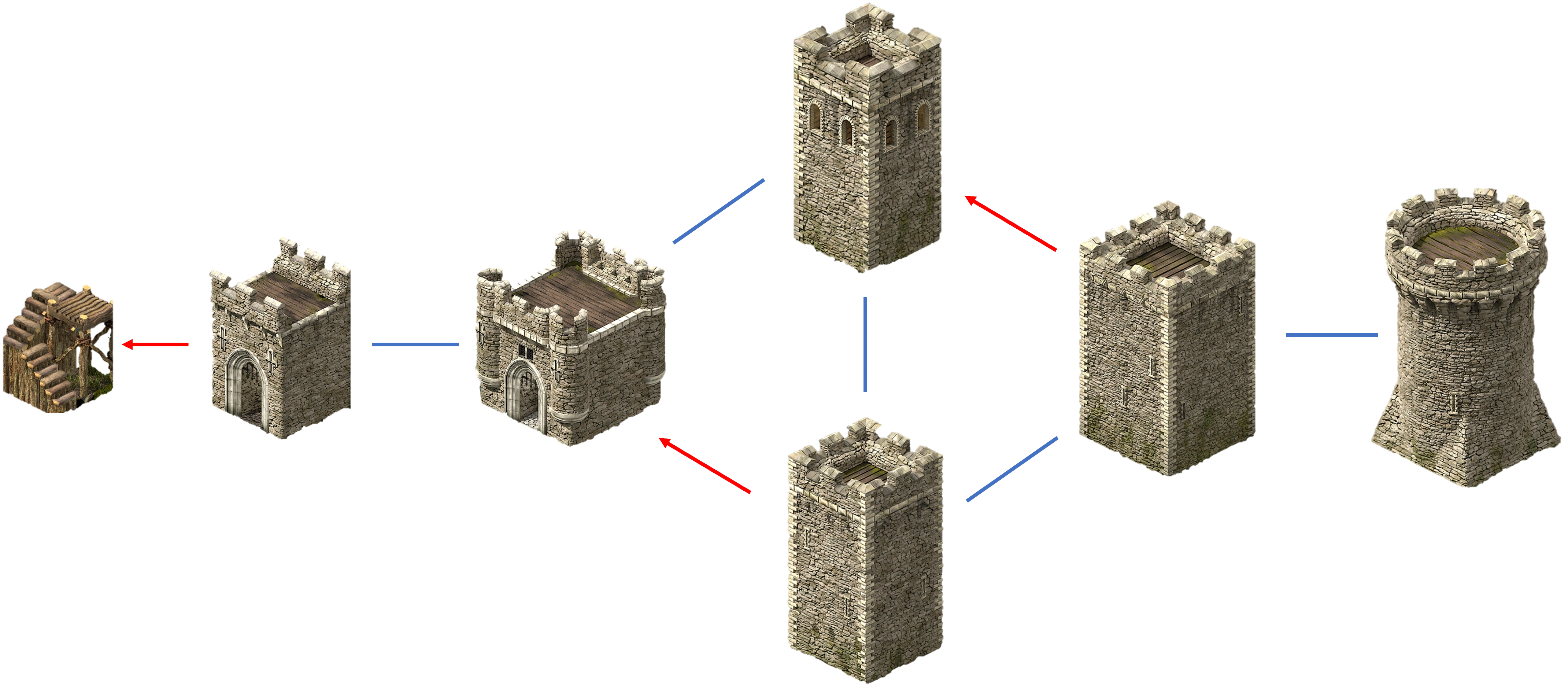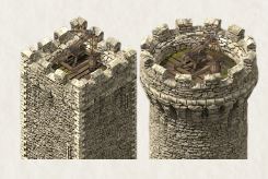 تصویر زیر مزیت زمینی برجهای قابل ساخت را نشان میدهد. این تصویر فرض میکند که برجها در ارتفاع یکسانی ساخته شدهاند. نکته قابل توجه این است که برج گرد، برج مربعی و برج دفاعی هیچ مزیت زمینی نسبت به یکدیگر ندارند. اگرچه برج مربعی و برج گرد نسبت به برج پیرامونی از مزیت زمینی برخوردارند. تغییرات ارتفاع بین قرارگیری برجها میتواند بر نتیجه مزیت زمینی تأثیر بگذارد، زیرا یک برج از آستانه اختلاف ارتفاع ۱۶ فراتر میرود. چیزی که در تصویر نشان داده نشده، دژ سنگی است که ارباب در آن اقامت دارد. این دژ کمی ارتفاع کمتری نسبت به دژهای دروازه دارد، تنها تفاوت این است که برجک پیرامونی نسبت به دژ سنگی از مزیت زمین برخوردار است. علاوه بر این، دژهای کوچک نسبت به دیوارهای سنگی از مزیت زمین برخوردارند. دقیقاً ۱۶ درجه اختلاف ارتفاع بین دژهای کوچک و دیوارهای سنگی وجود دارد، هرچند که این تفاوت ممکن است کوچک به نظر برسد.