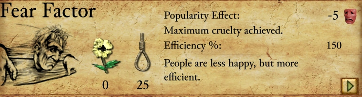 ضریب ترس منفی تعداد کالاهای تولید شده توسط ساختمانهای تولیدی را افزایش میدهد، اما محبوبیت و سلامت واحد را کاهش میدهد. این ضریب، خروجی آسیب واحد را افزایش نمیدهد. ضریب ترس -5، شادی را 5 درصد کاهش میدهد و سلامت واحد را 25 درصد کاهش میدهد، اما کالاهای تولید شده را 150 درصد افزایش میدهد! این امتیاز زمانی اعمال میشود که یک کارگر منابع را به انبار منتقل کند. یک کشاورز گندم در هر سفر با ضریب ترس 0، 2 گندم رها میکند. این مقدار با ضریب ترس -5 به 3 گندم در هر سفر افزایش مییابد. یک کارگر آهن در هر سفر با ضریب ترس 0، 1 آهن رها میکند. با ضریب ترس -5، او به طور متوسط 1.5 آهن در هر سفر رها میکند، در یک سفر 1 آهن و در سفر دیگر 2 آهن رها میکند.