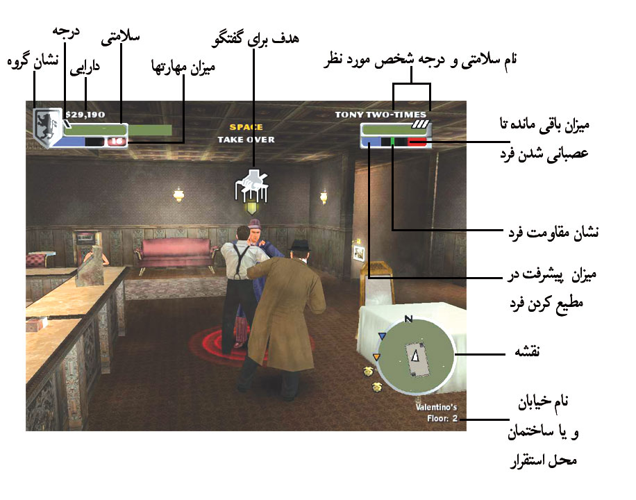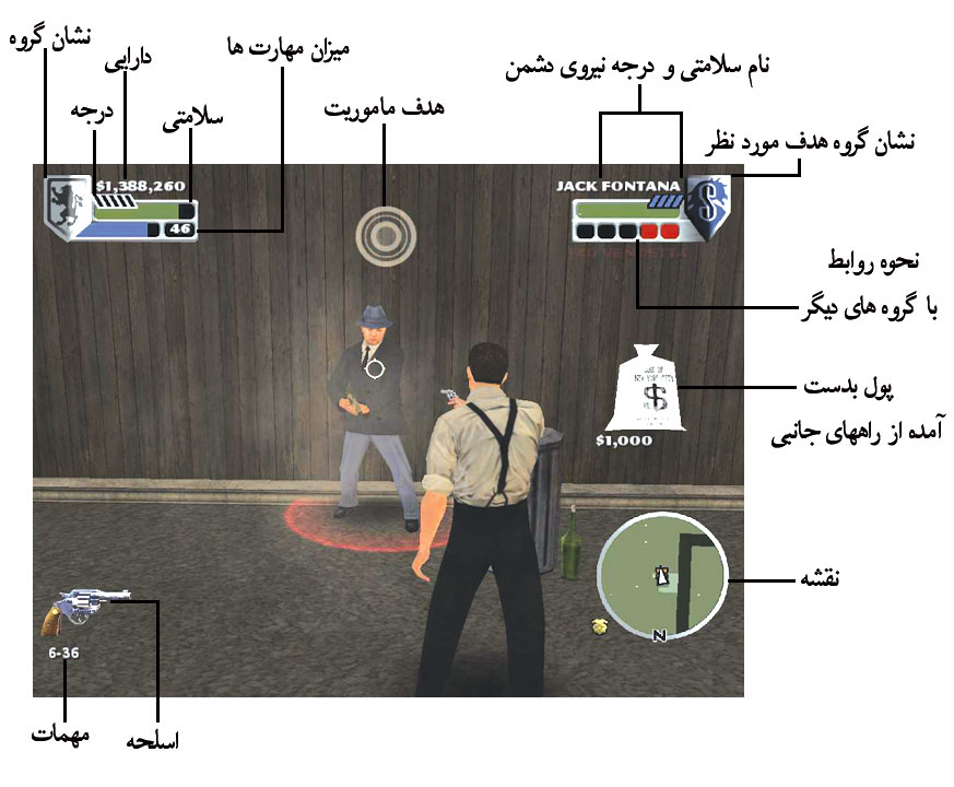 قلدری کردن یکی از بخشهای مهم این بازی است. با این حربه می توانیم مکانهایی که به دشمن خدمت می کنند را تصرف کنیم. همه موضوع با صحبت کردن آغاز می شود. هنگامیکه مغازه دار از همراهی با شما امتناع می ورزید می توانید او را به روش خودتان قانع کنید. در گوشه بالا و سمت راست صفحه (درست بروی نوار نمایشگر سلامتی شخصیت مورد نظر) نمایشگری نشان داده می شود. این خط سبزی است که نباید از آن عبور کنید. اگر به رنگ قرمز تبدیل شود، شما زیاده روی کرده و بازنده می شوید. هر قدر بیشتر فرد مورد نظر را گوشمالی بدهید مبلغ بیشتری به شما می پردازد. بدست آوردن مبلغ دلخواه چندان سخت نیست. او را نگه دارید و تا هنگام توقف در افزایش میزان پول دریافتی این کار را ادامه بدهید. سپس باردیگر با او صحبت کنید. در حین این مذاکرات معمولاً با نگهبانان و یا اعضاء سایر گروهها نیز روبرو می شوید. هدایت کردن خودرو در این بازی بسیار ساده است. یادگیری اینکه چطور از موانعی که بر سر راه شما قرار دارد اجتناب کنید، به سرعت حرکت کنید و فرد تعقیب کننده تان را گمراه کنید تا دست از تعقیب شما بردارد کار سختی نیست. باید از برخورد با اتومبیلها و شهروندان عادی اجتناب نموده و تلاش کنید که خودروهای دشمن با موانع برخورد کنند تا بتوانید آنها را پشت سربگذارید. نقشه موجود در بازی نقش بسیار مهمی را ایفا می کند. بهتر است قبل از هر حرکتی در مسیرهای مختلف نگاهی به آن بیاندازید تا در هنگام هدایت خودرو گمراه نشوید. تمام موقعیتهای مهم (مثل بیمارستانها و انبارهای خانواده های رقیب ) بر روی نقشه مشخص شده اند. اگر بخواهید می توانید موقعیت مورد نظرتان را بر روی نقشه معین کنید تا در حین بازی بتوانید آن را بر روی نقشه ملاحظه کنید.