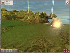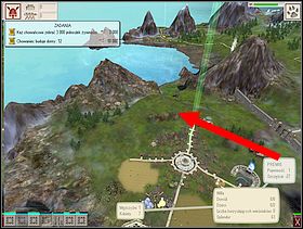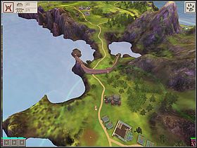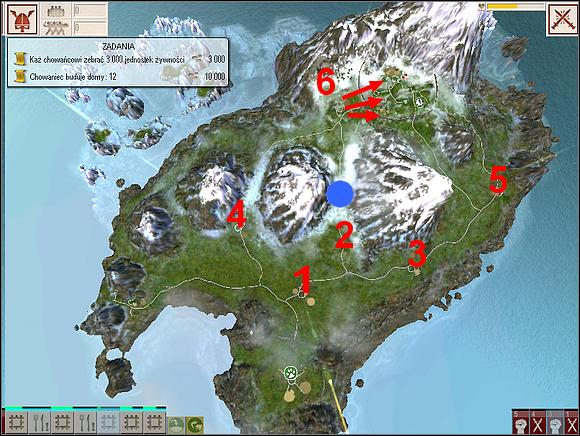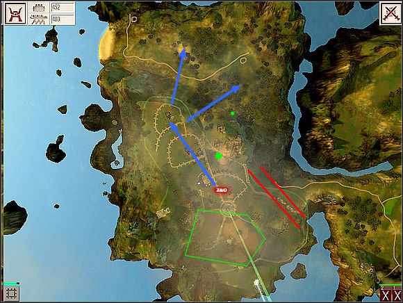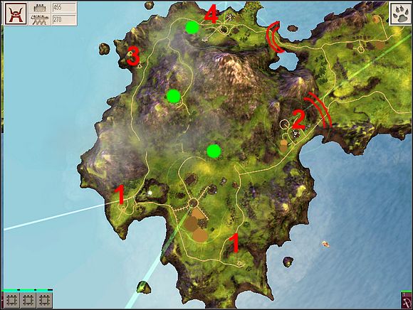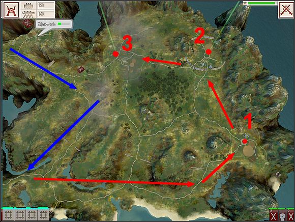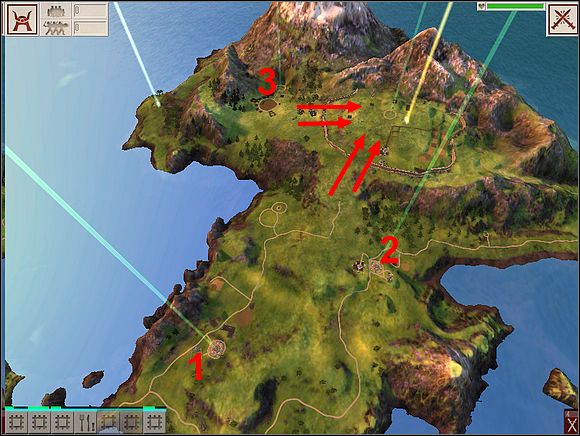کشور گشایی خود را مطابق با جهت پیکانها (شکل زیر) انجام دهید و به سمت ساحل جنوبی حرکت کنید. همواره موجودتان را در جلو ی سایر نیروها قرار دهید. وظیفه او پاکسازی منطقه است، خصوصاً از بین بردن گروههای دشمن در شهرهایی که تصرف می کنید. برای تصرف اولین شهر با مشکل چندانی روبرو نمی شوید. در دومین شهر، دیوارها و کماندارانی که برفراز آنها قرار دارند و منجنیق هایی که برروی آنها جاسازی شده اند، مشکلات اصلی شما را تشکیل می دهند. برای تصرف این شهر از موجودتان کمک بگیرید. دروازه را همانند قبل از بین ببرید. بزرگترین مشکل شما تصرف شهر چهارم است. چون درآن بیماری وبا شیوع پیدا کرده است. تحت هیچ شرایطی نیروهایتان را به آنجا اعزام نکنید چون کشته می شوند. ابتدا باید مردم روستا را درمان کنید. این کار را با درخواست مداوای شهر بیمار انجام دهید. پیکانهای آبی نمایشگر راهیست که دشمن نیروهایش را از آن به سمت شهر شما اعزام می کند. مراقب باشید و اجازه نفوذ به دشمن ندهید. دروازه هایتان را بسته نگه دارید و زمانی که افراد دشمن به شما نزدیک می شوند با جادوی آتش آنها را از بین ببرید.