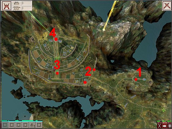 ابتدا، آخرین دهکده را تصرف کنید.(نقطه 1) نیروهایتان را درمان کنید. (نقطه 2) موقعیت دیوار و کمانداران بالای آن را معین می کند. با استفاده از موجودتان آنها را نابود کنید.