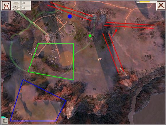 مسیر منتهی به تپه ها به وسیله دیوار مسدود شده است (سه خط قرمز روی تصویر). با از بین بردن دروازه ها از آنها عبور کنید. برای این منظور ابتدا کمانداران بالای دیوارها را از بین ببرید. این کار را با استفاده از موجود انجام دهید.او را در فاصله مناسبی قرار دهید که در تیررس دشمن نباشد. به محض این که حضور دشمن را حس کند با استفاده از جادوی آتش آنها را هدف حمله قرار می دهد. سپس دروازه را از بین ببرید. زمانی که این محوطه پاکسازی شد، به سرعت ارتشی مهیا کنید. باید حداقل 150 سرباز داشته باشید. بهتر است که دو گروه باشند.